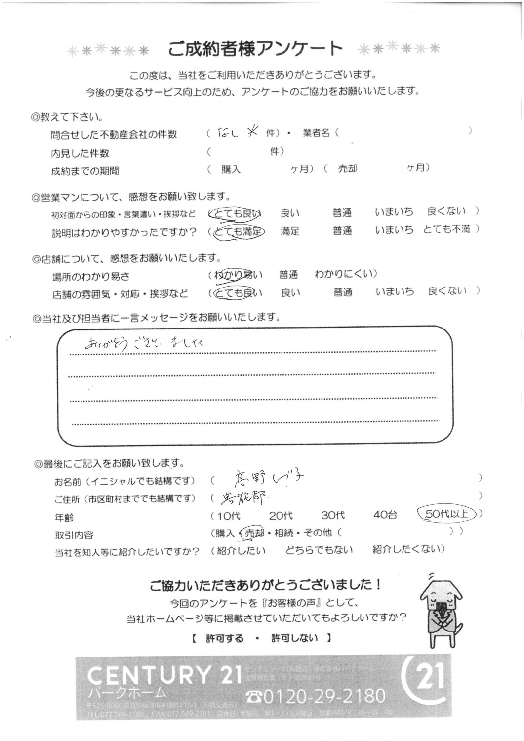 お客様の声詳細 大阪府S.T様 アンケートを見る ありがとうございました。 お礼の言葉が頂きましてありがとうございます。 ご遠方からのご売却依頼で、お電話でのご対応になっていましたので 不安もあったかと思いますが、無事ご納得頂けるかたちで売却が完了出来た事 を嬉しく思います。 担当 / 下井 真人