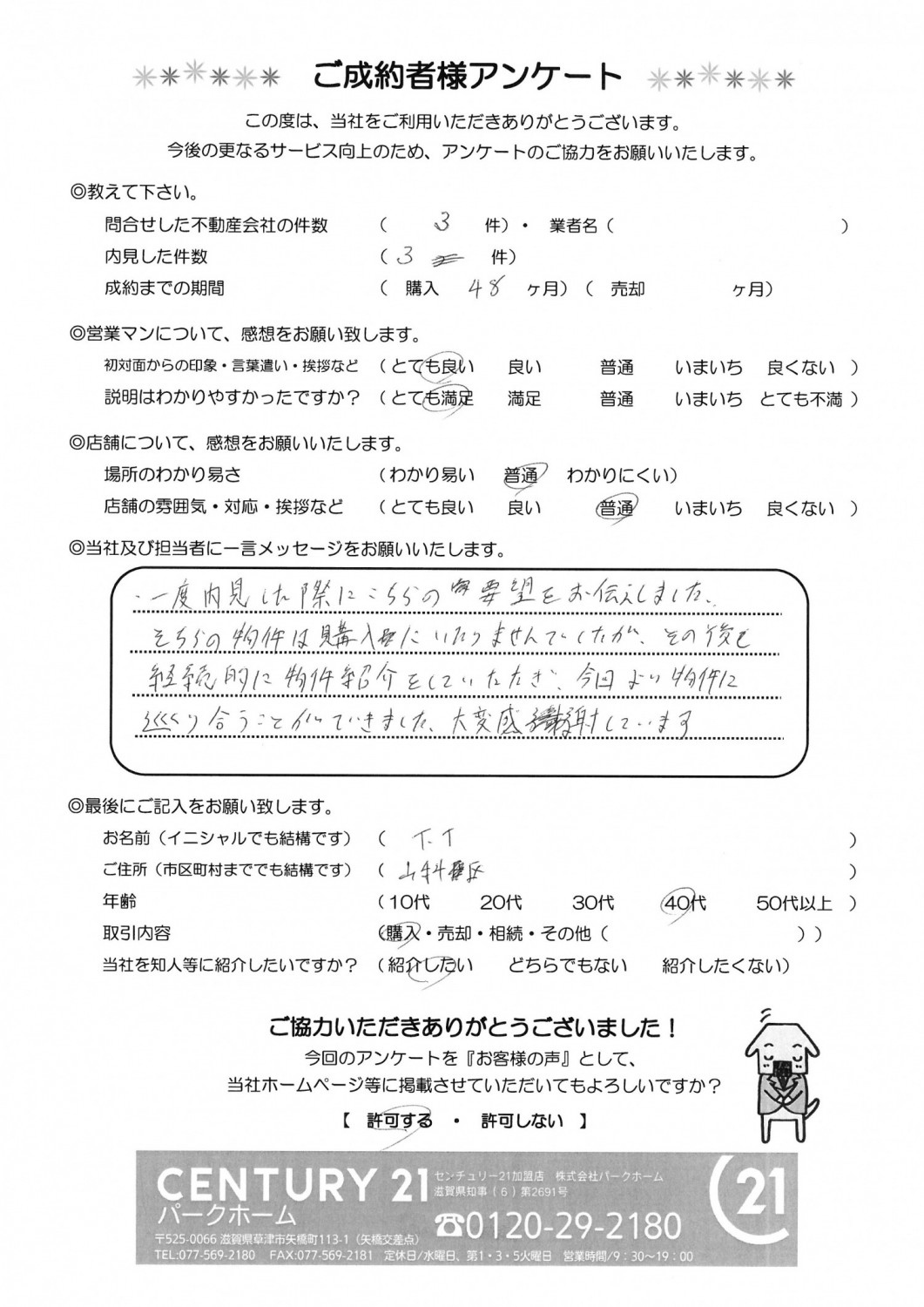 そちらの物件は購入にいたりませんでしたが、その後も継続的に物件紹介をしていただき、今回よい物件に巡り合うことができました。大変感謝しています。
