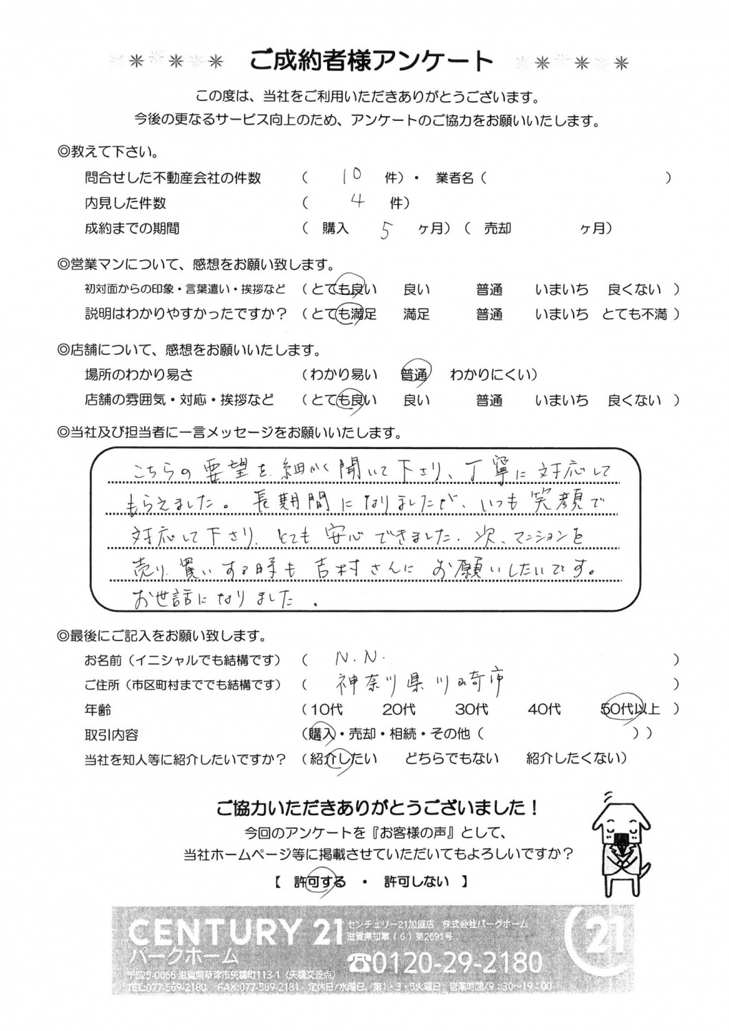 こちらの要望を細かく聞いて下さい、丁寧に対応してもらえました。長期間になりましたが、いつも笑顔で対応して下さい、とても安心できました。次マンションを売り買いする時も吉村さんにお願いしたいです。お世話になりました。