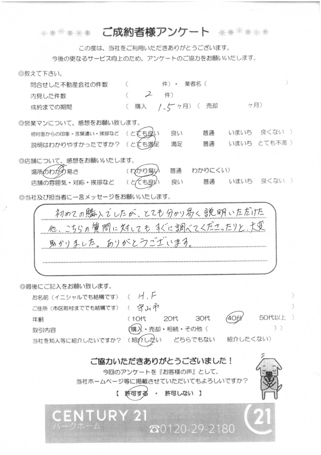ご説明がわかりやすかったとのお言葉、また迅速な対応にご満足いただけたとのこと、大変嬉しく存じます。不動産のご購入は、多くのお客様にとって人生における重要な決断のひとつです。少しでも不安を解消し、安心してお進めいただけるよう努めてまいりましたので、このようなお言葉をいただけることは、私どもにとって何よりの喜びでございます。