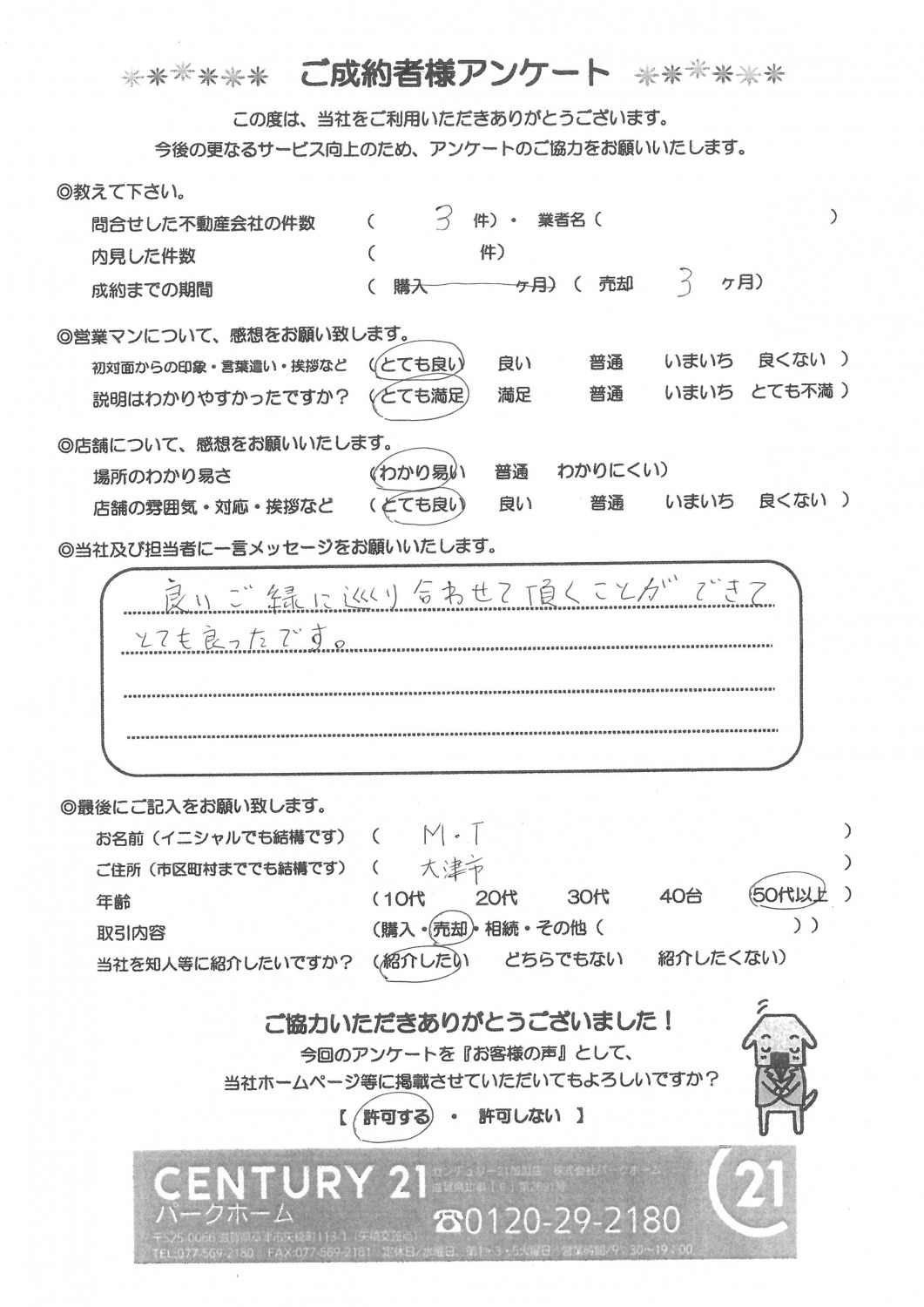 お客様の声詳細 大津市M・T様 アンケートを見る 良いご縁に巡り合わせていただくことができてとても良かったです。 今回はご相続が絡むお取引で、ご協力いただた部分も多々ございましたが、無事にお引き渡しができて良かったです。 また不動産のことでお困りごとあればお気軽にお声掛けくださいませ。 この度はお取引いただき有難うございました。 担当 / 服部 洋平