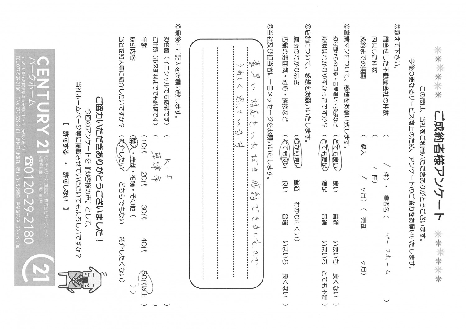 お客様の声詳細 草津市K・F様 アンケートを見る 素早い対応をいただき成約できましたので、うれしく思っています。 この度はご成約いただき有難うございます。 長くお家をお探しされていたと思いますが、なんとか気にいっていただけるお家を見つけることができ嬉しく思います。 またご機会あればどうぞよろしくお願いいたします。 担当 / 服部 洋平